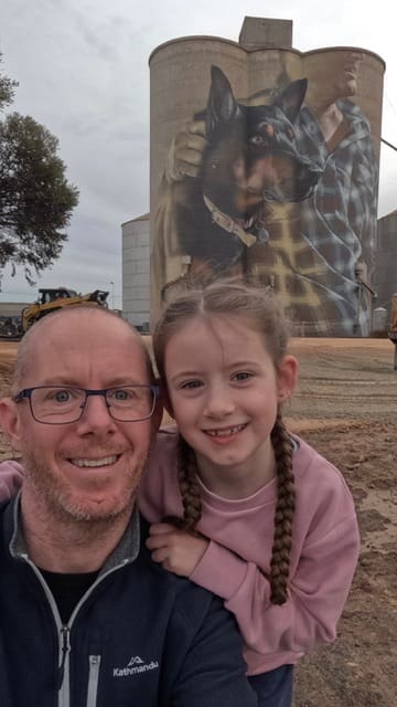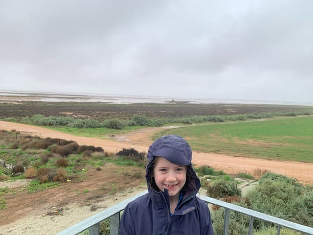 The next day we woke up to the sound of roosters squawking and rain. On the road I listened to more audiobooks. The first stop was at a silo with an Aboriginal girl on a swing. I thought that it was unique with its colours. Then we went to Lake Tyrell. Lake Tyrell is normally a pink lake but today it was all muddy because of the rain. It was formed when the water rose to the land and then retreated back to the ocean and left behind salt lakes. I wasn’t feeling well at the bakery where I ate three quarters of a sausage roll with sauce. In the car I had a nap. We went to see the biggest tractor in the world called Big Lizzie. Then we crossed over the border into South Australia to get to Berri. At Berri we are staying at Mallee Fowl Restaurant. The ground is red sand and there are peacocks, chickens, emus, goats and bats.