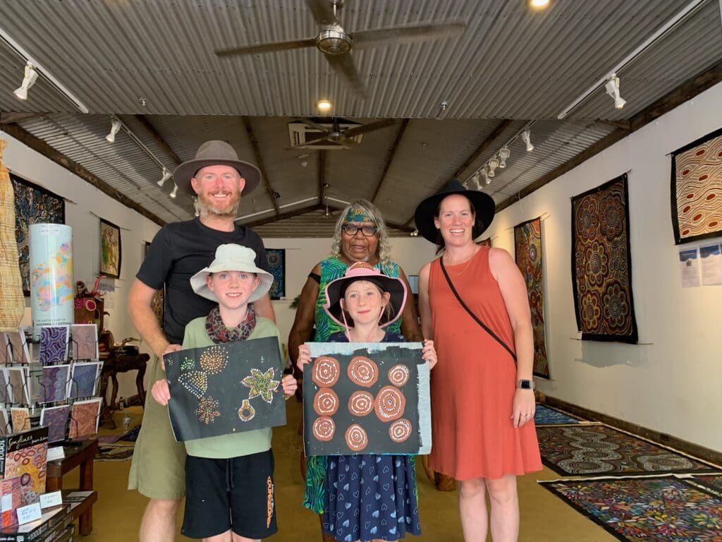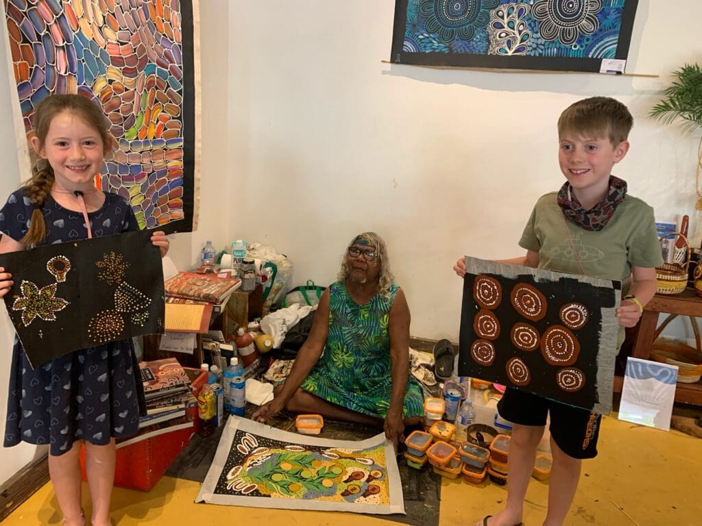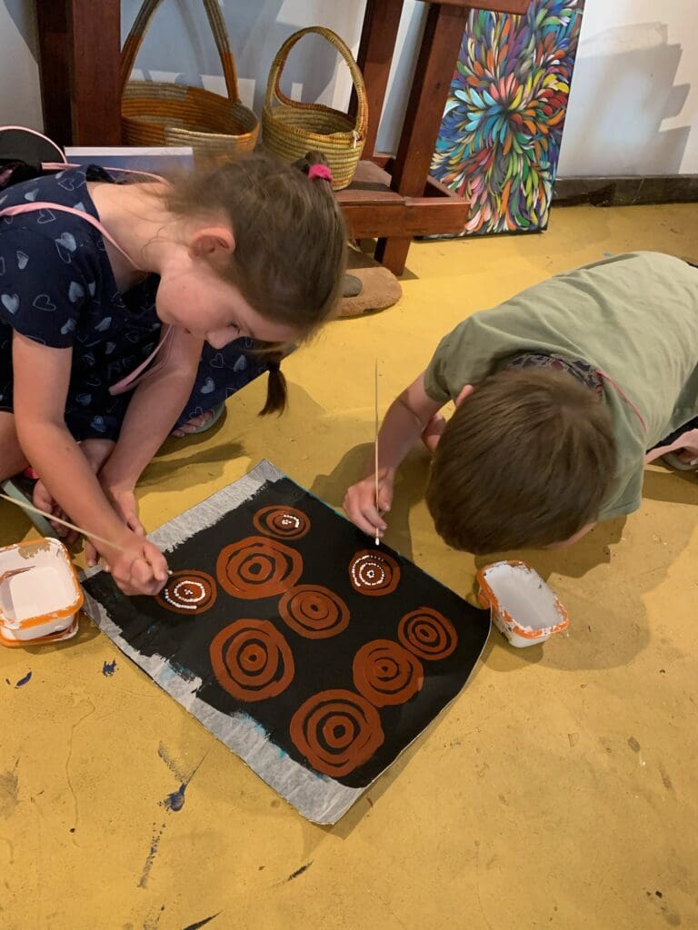When we went shopping we went to an art gallery where we saw an Aboriginal lady called Sonda. She called us over to paint with her. She said not many kids  got to paint with her because she doesn’t ask them unless they’re really good kids. We painted random stuff and water holes. Me and Isaac felt super lucky. We got to take our paintings home then I felt very very lucky.