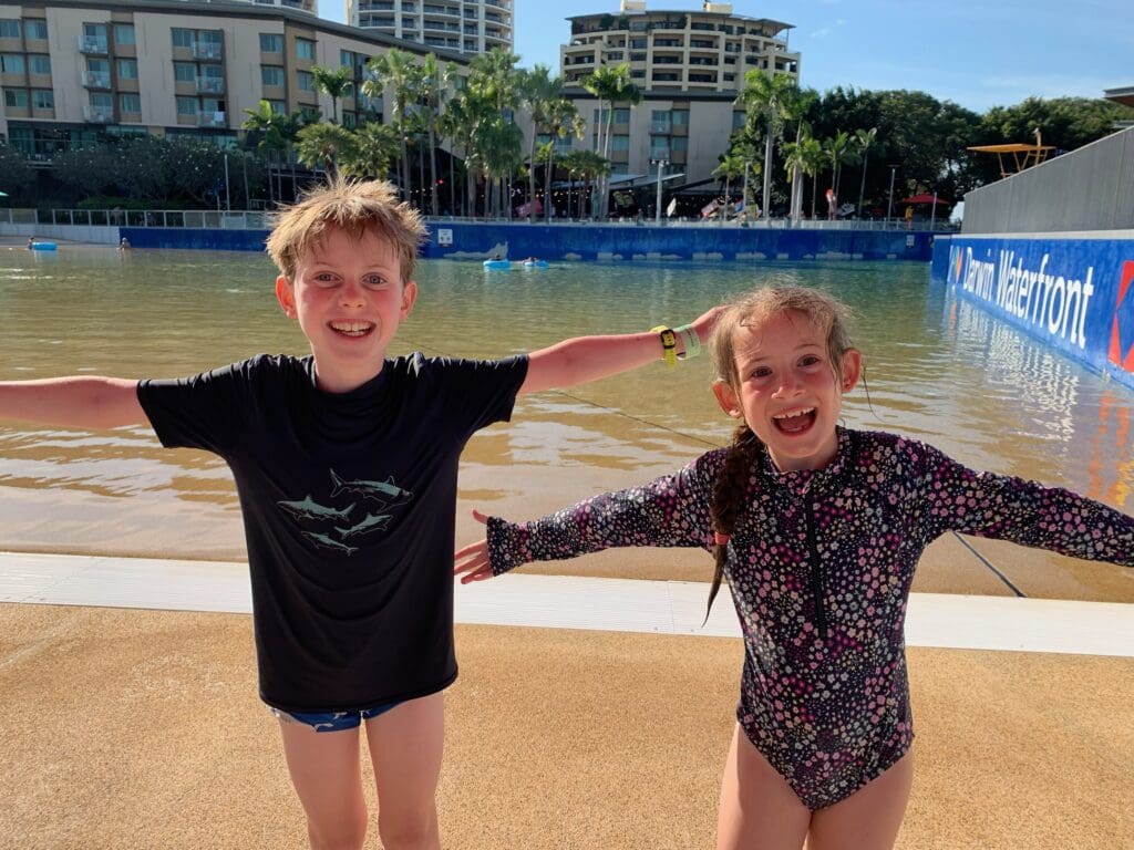 In Darwin we went to some amazing swimming places like the water park. At the water park I first thought I’m not going on those slides, but then I went down all 3. The first one I went down was the green one. In there we saw rainbow lines glowing. I went down it with Dad in a double donut because we could not go down it without some one.