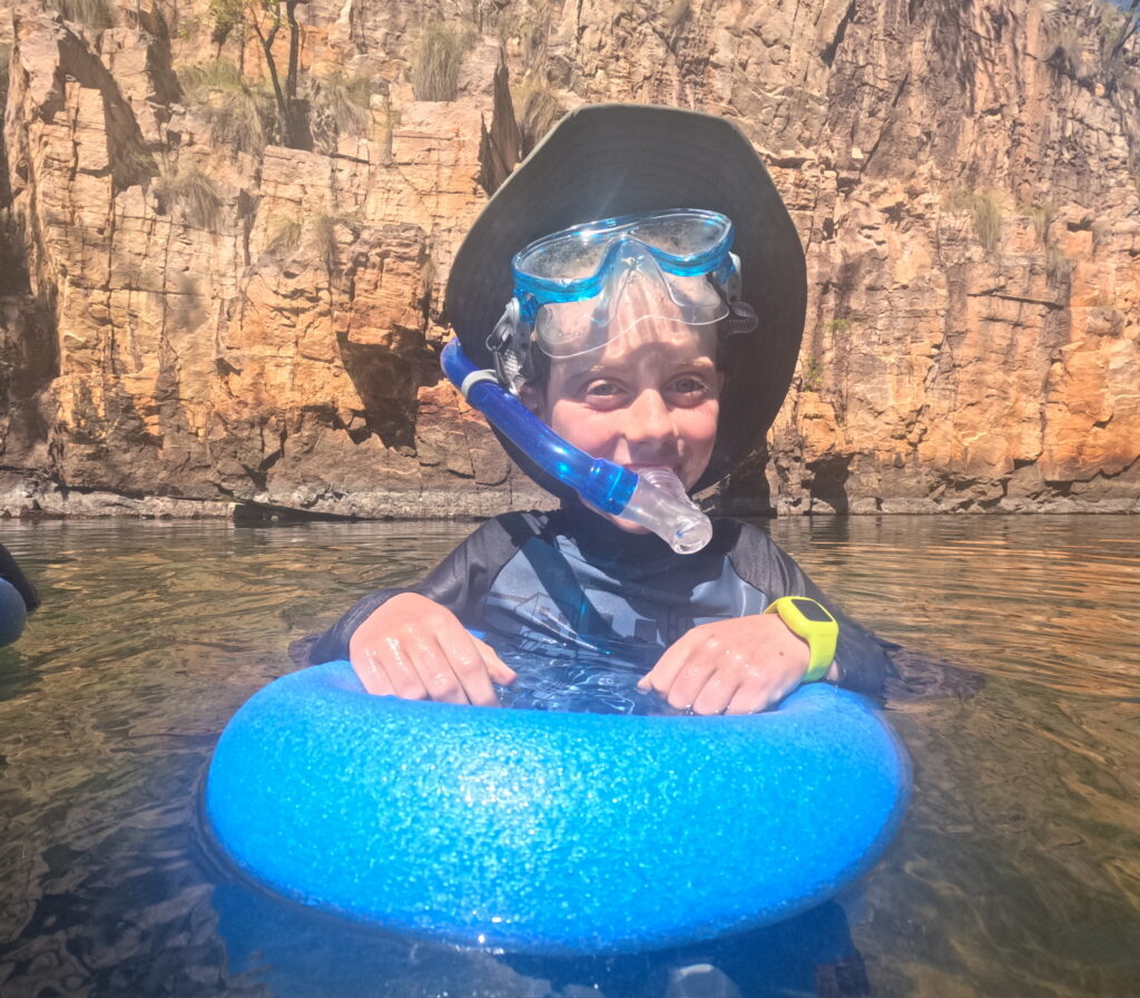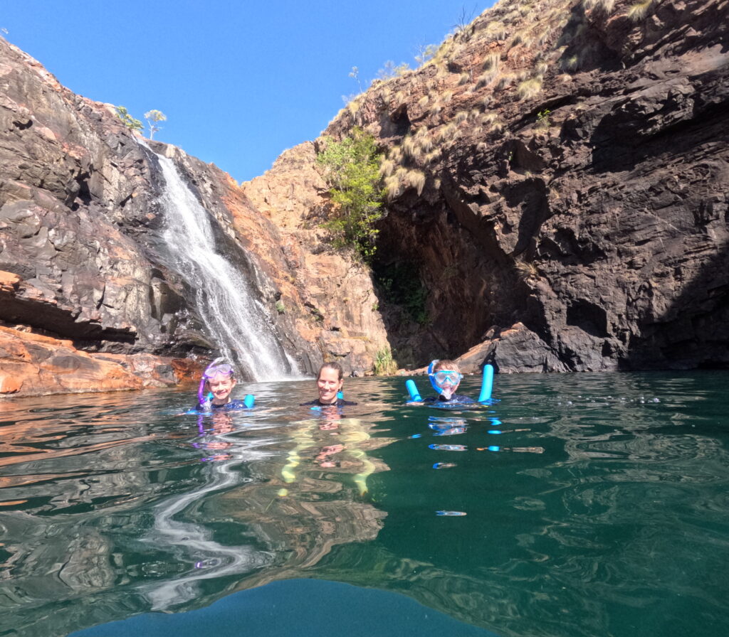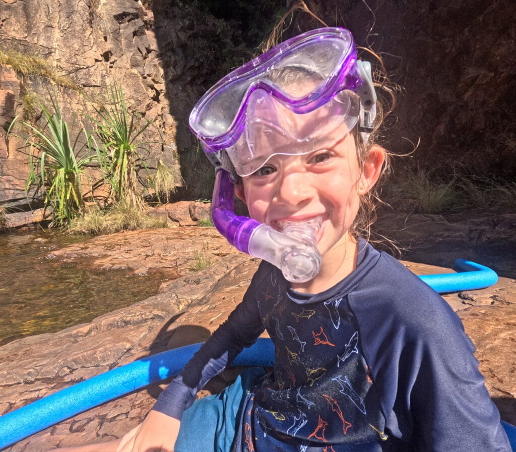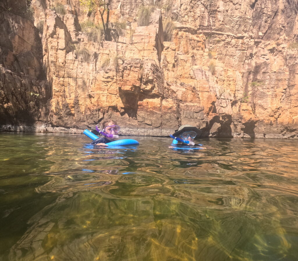 Our first campsite was Maguk with a beautiful waterfall next door that we swam in. When we swam in it we used our snorkles that daddy bought in Katherine. We saw lots of little barras and zebra looking fish. I put my head under a waterfall for the first time and it was a bit noisey but it was relaxing too.