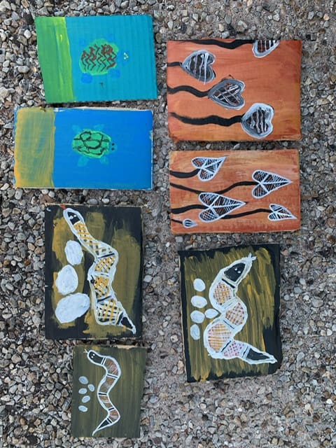 Our last day in Kakadu we waited for the painting workshop. When they were setting up I felt really excited. I thought we were going to do dot painting but it was line painting. We were given paints and some pictures to copy. I painted some water lillies but they didn’t look exactly the same as the picture