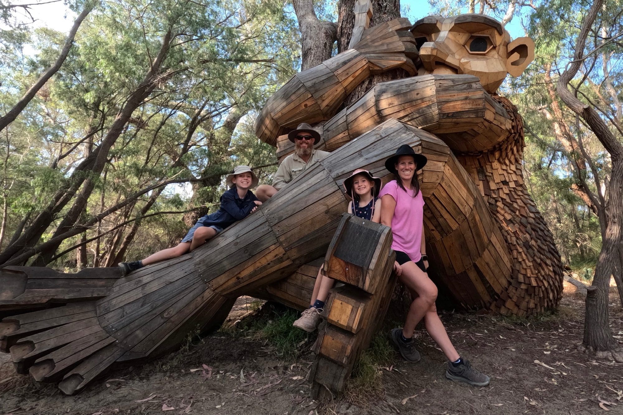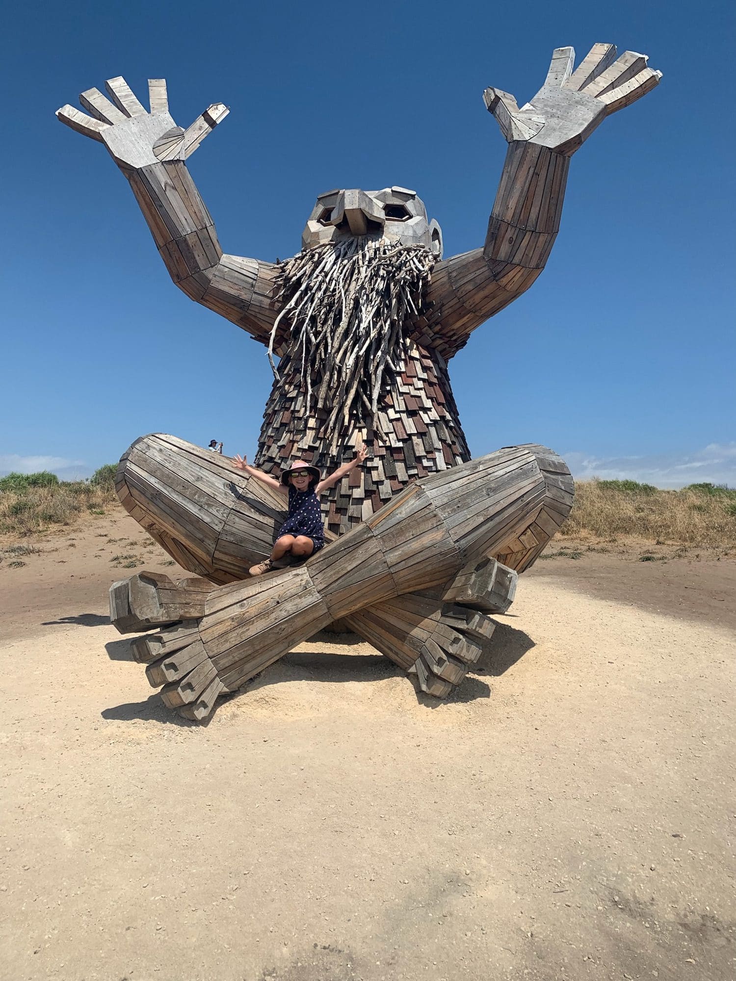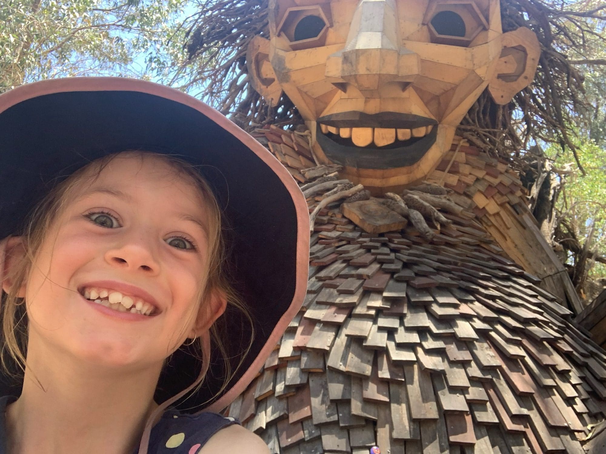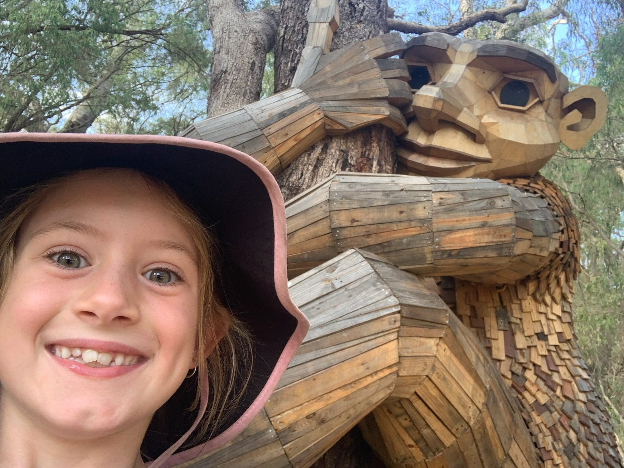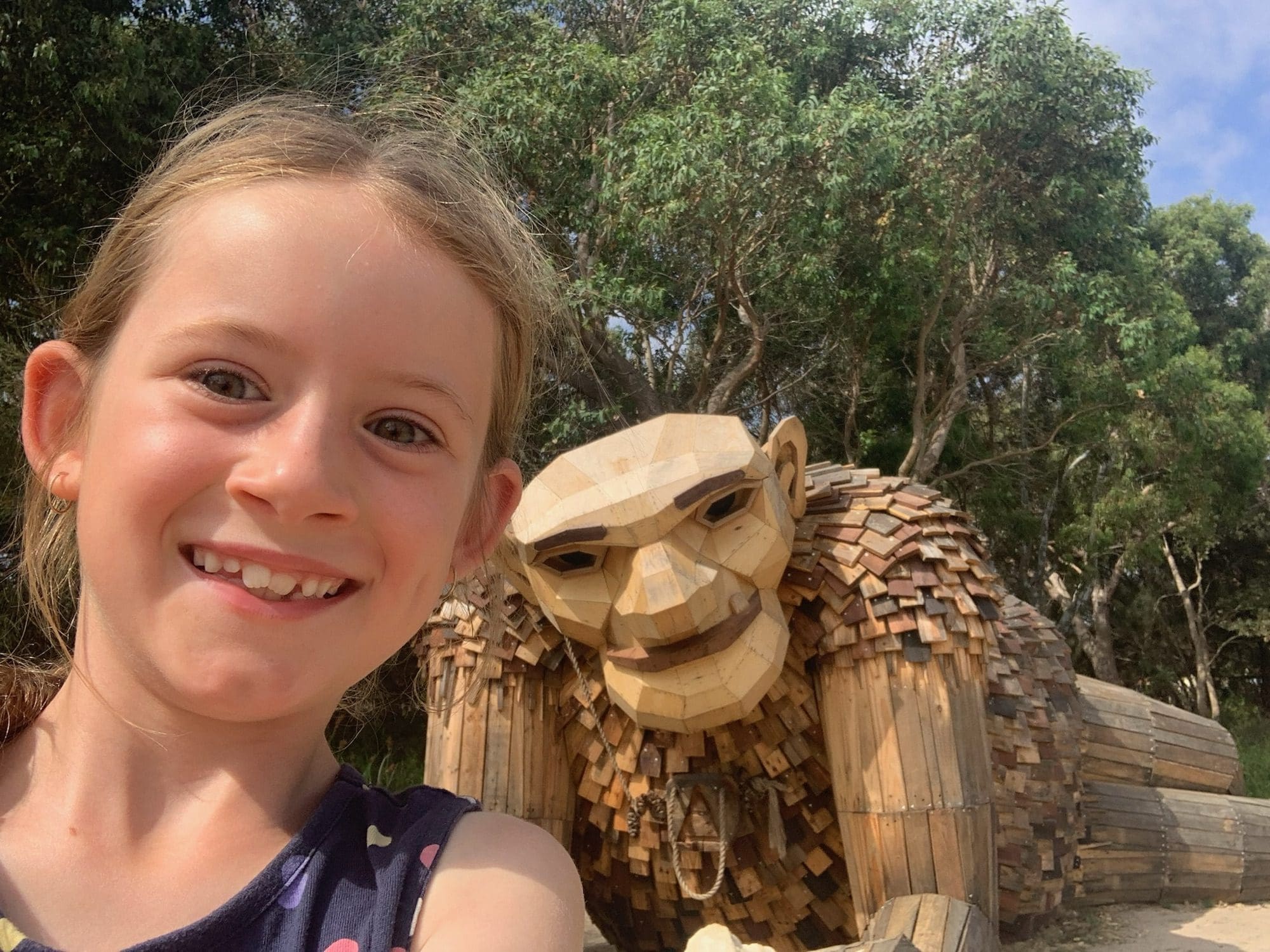 The first giant we saw was Little Lui. The walk to Little Li was bushy and it was 1.3kms. Little Lui was the smallest giant of them all. She was lying down near a tree. She was amazing. She was made of wood. Next we went to Santi. He was a big giant looking out to the sea. He had his hands up and his legs crossed. He also had a big bushy beard like Daddy and Pete. Santi was amazing. Seba was the next giant we saw but it was hard to see from the rocks because it was designed for people to see from the water. He was still cool though. Seba had a trumpet under one arm and shaded his eyes with the other. After we did all the other giants we went to Jyttes Hytte (the secret giant). It was a 1km walk to the secret giant. When we got there we saw a very cute giant hugging a tree. He had little bum cheeks. He was my favourite giant in Mandurah.