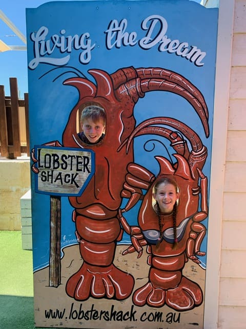 When we were at Jurien Bay we went to the tackle shop because it had a big sale. When we were in there I was shoulder to shoulder with lots of people. After that we went to a big park with a big slide and ropes that looked like a monkey enclosure. Isaac and I also played on a tinny that was in the playground and pretended we were pirates. We went to The Lobster Shack for lunch. We sat outside on the stools watching all the fishing boats. I had fish and chips. Isaac and dad had half lobster each and mum had chips. In the afternoon we went fishing for Taylor at one of the beaches. We caught lots of little fish and kept three taylors. When the sun went down all the taylors started biting. We had to use our head torches and we saw a huge ray swimming up and down the beach in front of us.