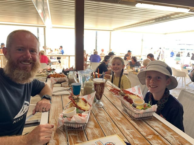 All you do is lots of eating trying different things. Yum yum the fish and chips. Isaac and daddy’s lobster looks amazin. Did you try any? I think a tackle shop is your favourite place now to shop. That would be alot of people in the shop too sqashy for me.