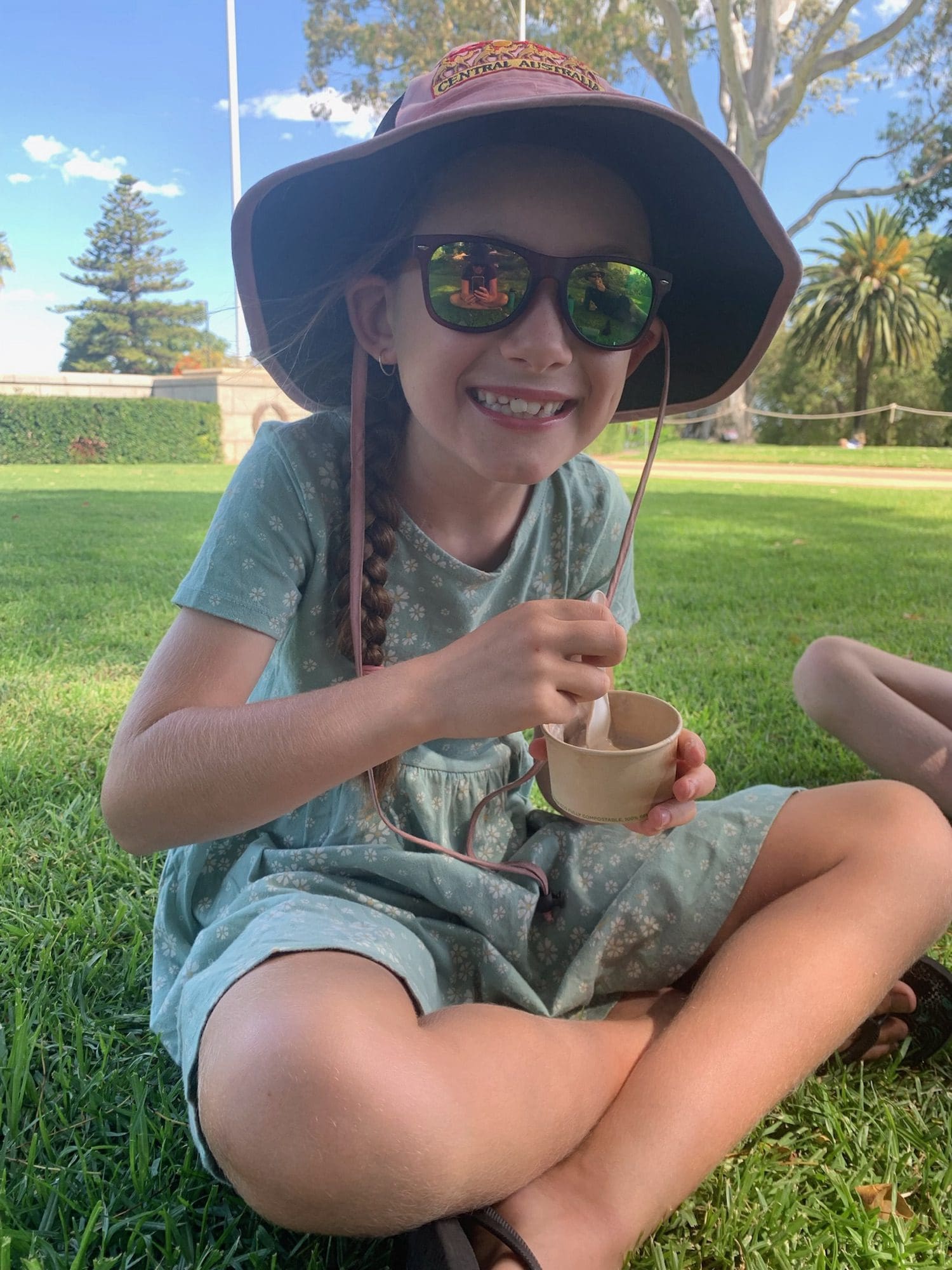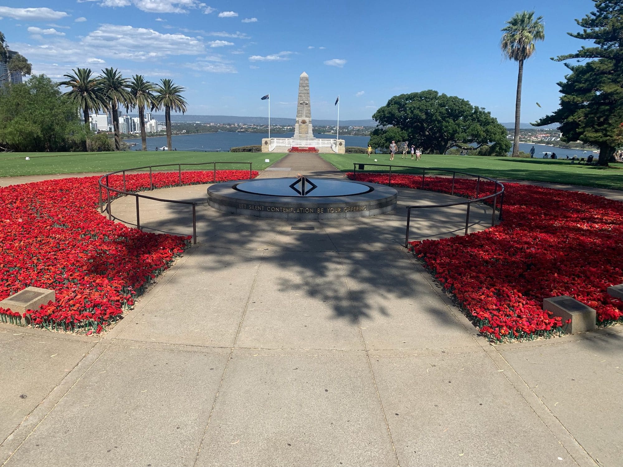 On Saturday we went to the beautiful Kings Park to do some walks and read our books. First we went into Naturescape which was a kids area where there are lots of ropes and platforms to climb. When we were at the ropes Dan came and saw us. When we were leaving naturescape Dan showed us his buggy that he drives. Isaac asked about the towball. We walked through lots of wonderful gardens with lots of different plants. Then we went over a big glass bridge and we could see the Perth buildings. After the glass bridge we saw a big boab tree that was moved from The Kimberleys. It was a hot day so we got some ice cream and ate it on the grass. I had cookies and cream. We then went to the eternal flame for the soldiers. Around it was lots of knitted and crocheted poppies stuck in the ground. It looked amazing. Around the poppies was a big wall called the whispering wall. Dad sat at one end and Isaac sat at the other and they could talk to each other. We moved the car closer to the fountains and grass area so we could read our books and playing with the frisbee. I thought Kings Park was a really lovely place.