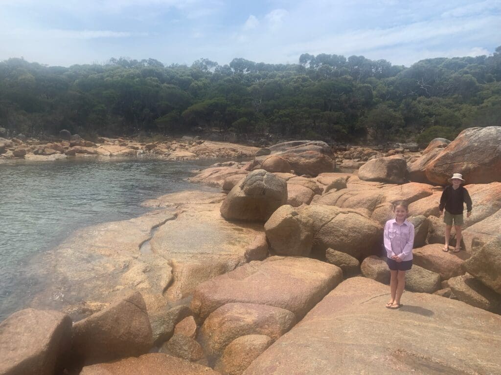 The afternoon we got to Cheynes beach Isaac and dad went fish whilst me and mum drew pictures in the sand. Isaac caught a flathead and dad had a donut day. I drew all of us being elephants and some aliens. Mum drew a cat in the sand.