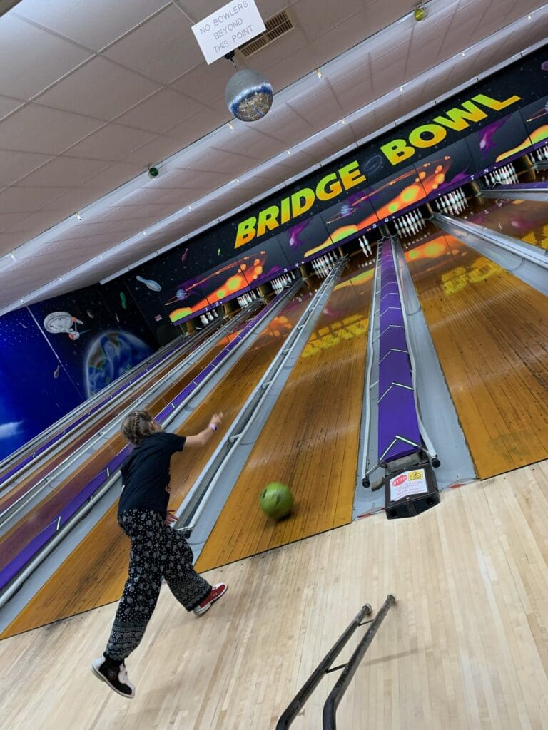 The next morning we moved to a powered site because someone else had booked Little Miss. After we set up the camp trailer we went to a playground to have a play. Then we went ten pin bowling. When we were bowling we had to wear funny shoes. The first game I came fourth, Isaac came third, Dad came second and Mum came first. The last game I came fourth, Mum came third, Isaac came second and Dad came first. I’m not the best at bowling but it was a good day for me.